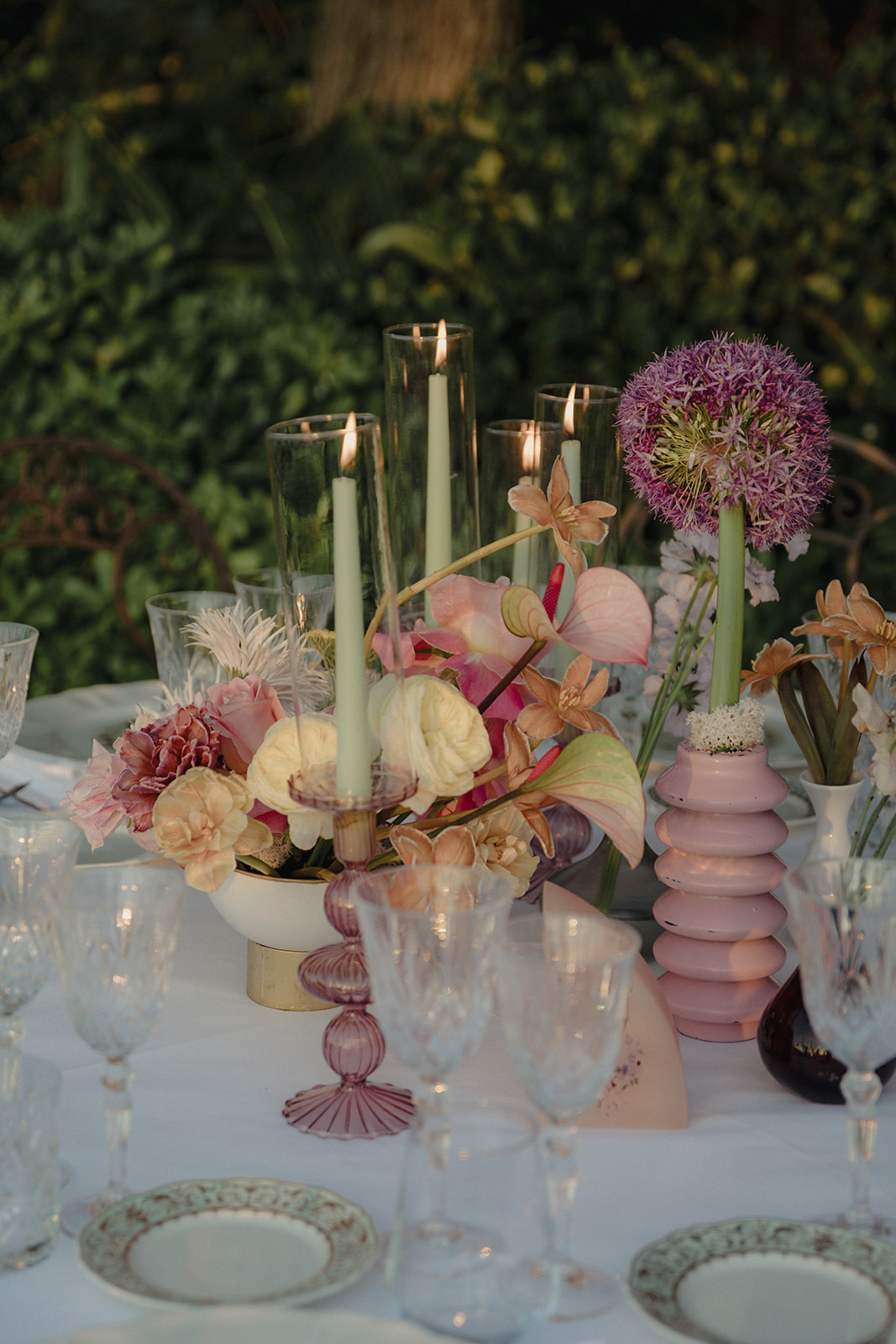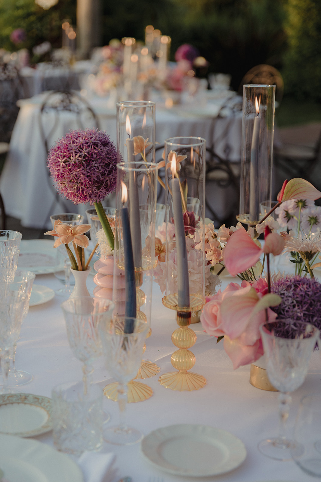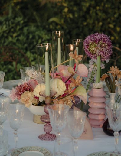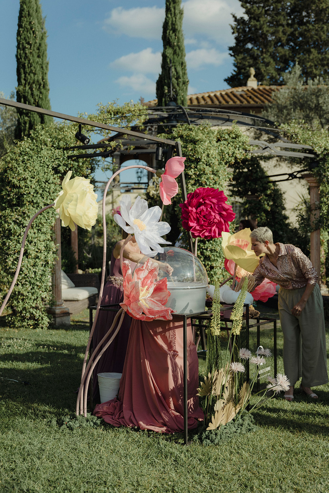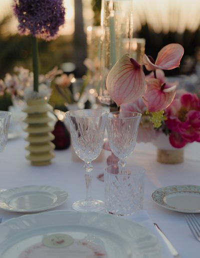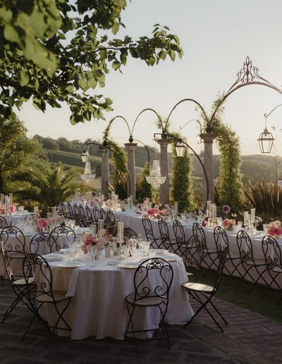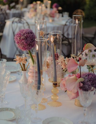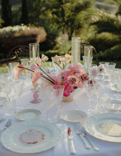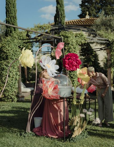 The design of the wedding explored a dialogue between contemporary style, fashion-inspired details and expressive colour palettes. Modern elements and bold decorative choices brought a vibrant energy to the event, creating a dynamic contrast with the historic atmosphere of the Tuscan estate.