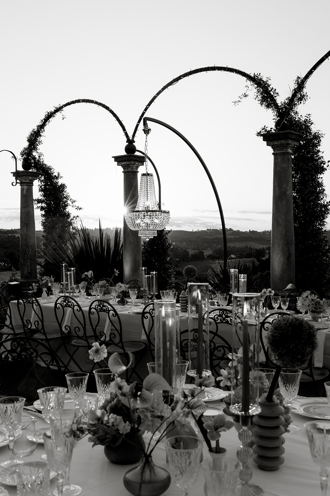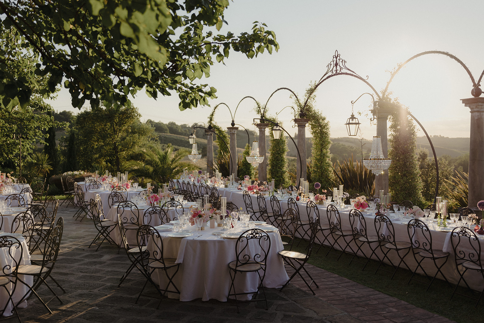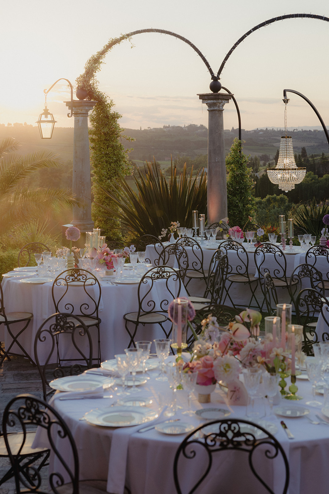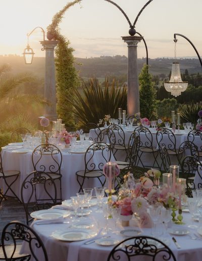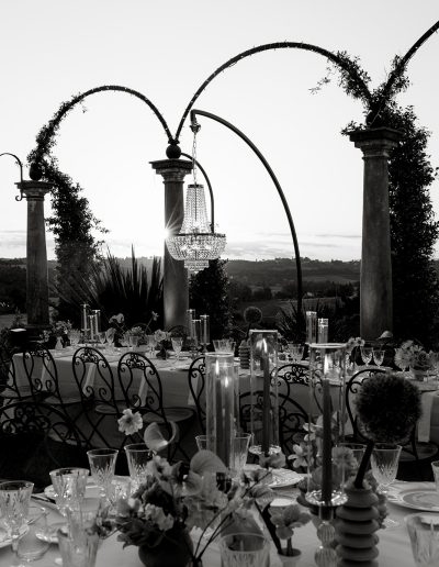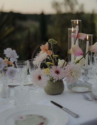 For Megi and Marco, the vision was to create a refined destination wedding in Tuscany where colour, design and atmosphere would reflect their personalities while embracing the beauty of the surrounding countryside. The setting offered breathtaking views over the Tuscan hills, providing a naturally dramatic backdrop for a celebration that combined sophistication with joyful spontaneity.