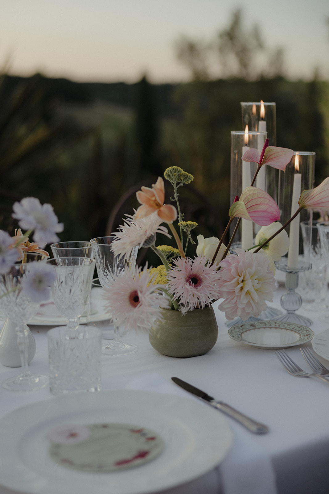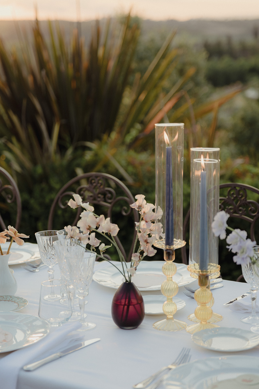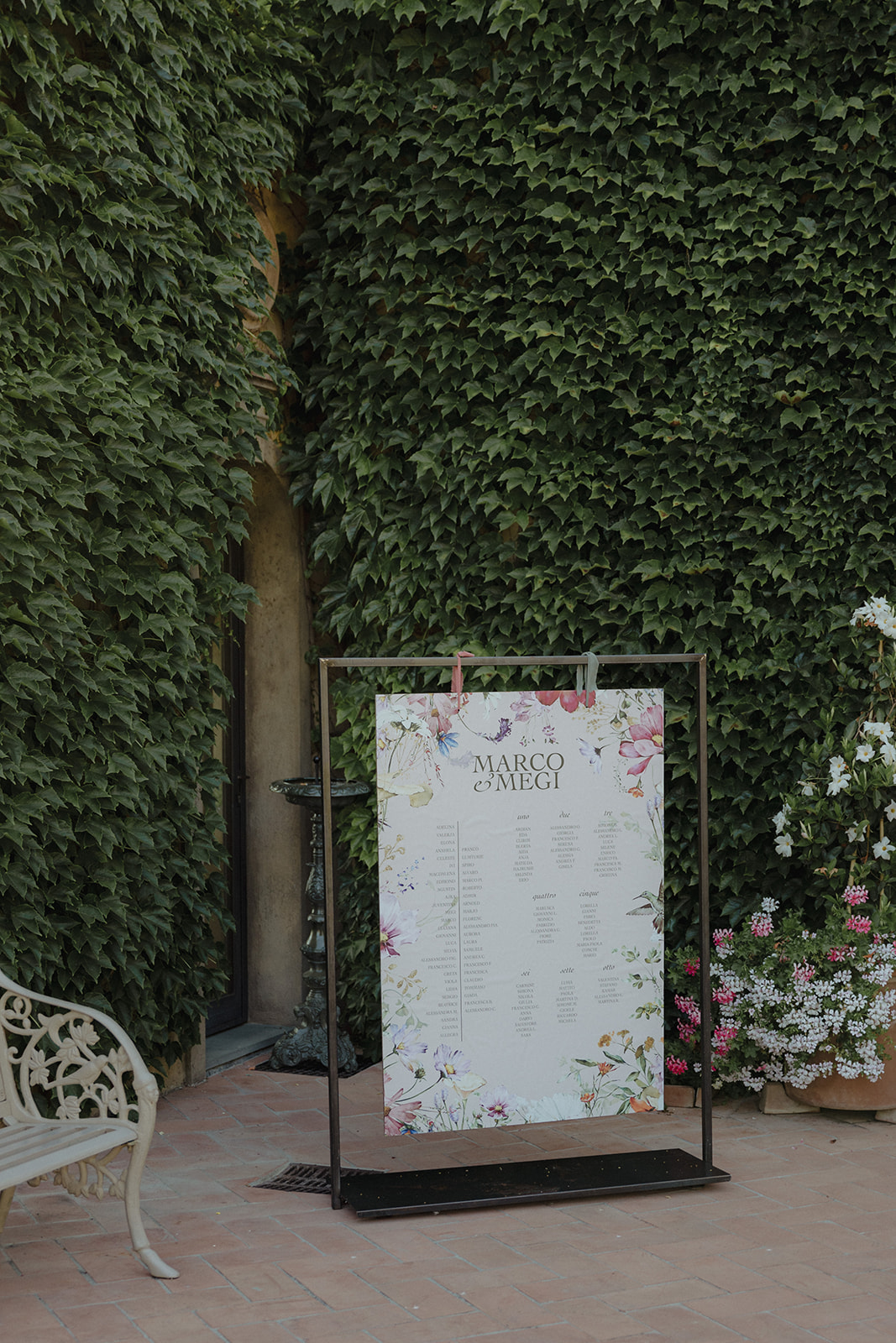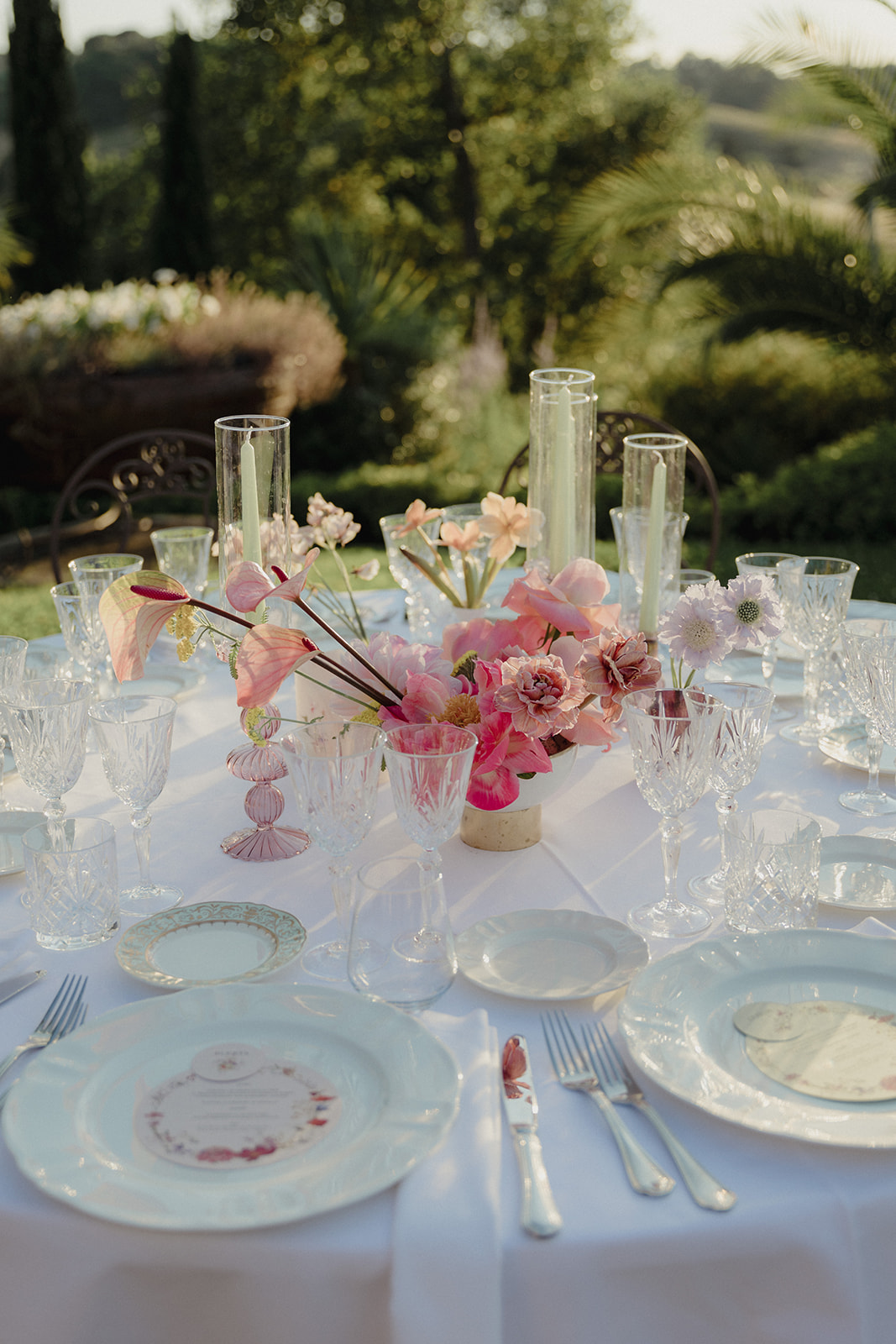 For Megi and Marco, the vision was to create a refined destination wedding in Tuscany where colour, design and atmosphere would reflect their personalities while embracing the beauty of the surrounding countryside. The setting offered breathtaking views over the Tuscan hills, providing a naturally dramatic backdrop for a celebration that combined sophistication with joyful spontaneity.
