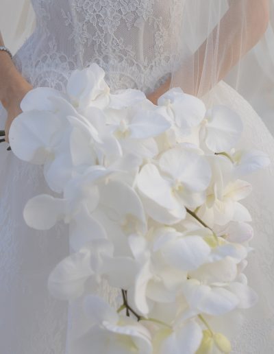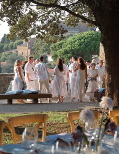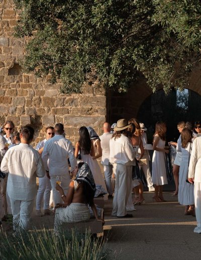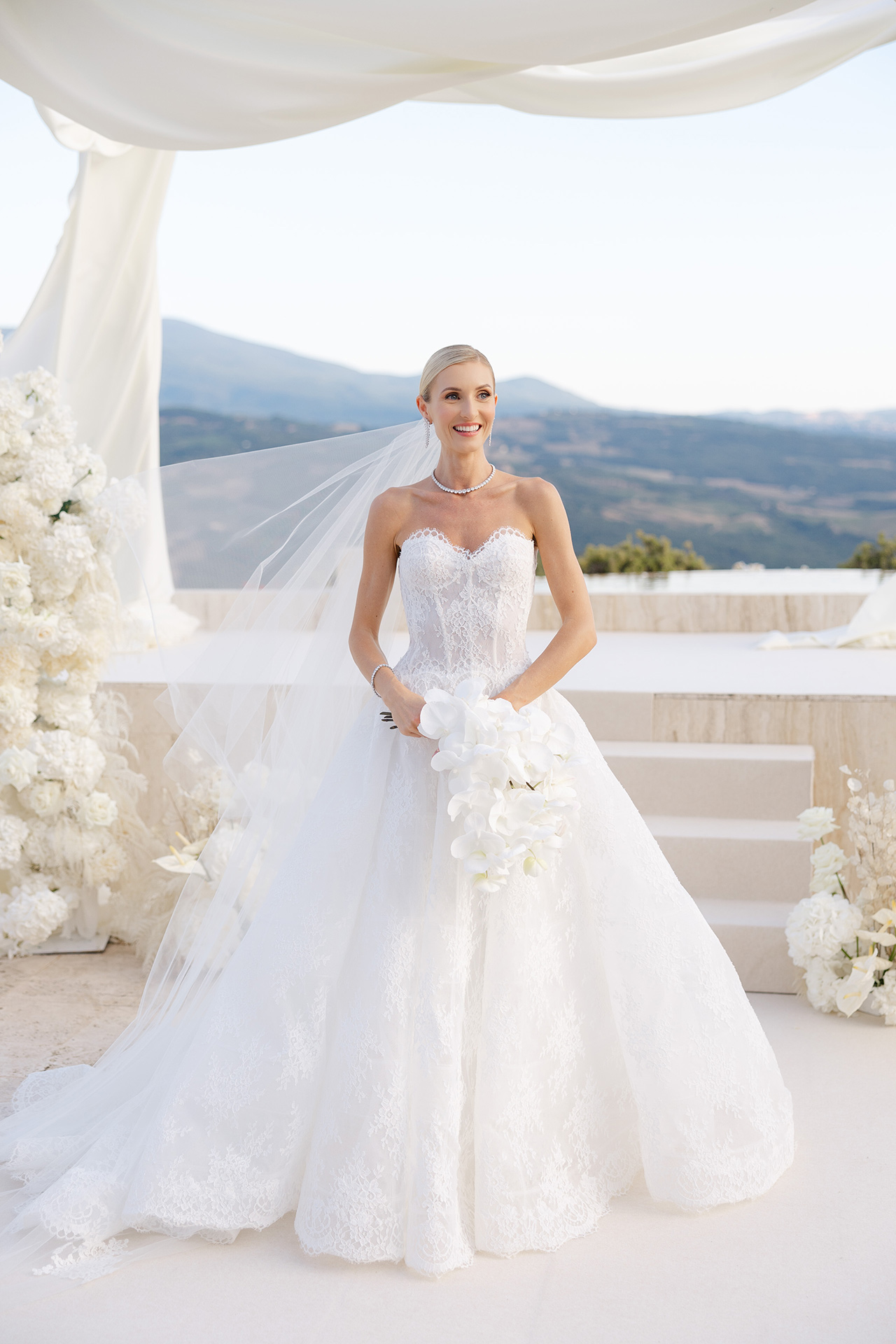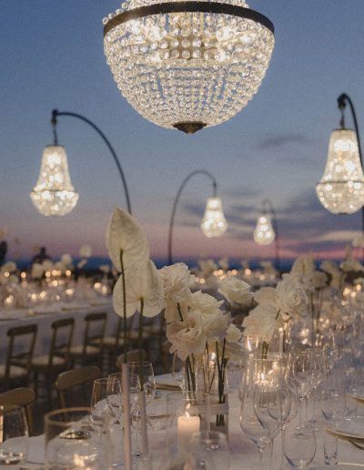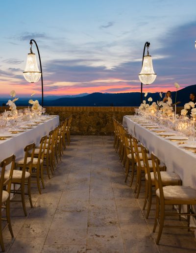 The visual design of the wedding embraced a refined palette of white and gold, enhanced by delicate floral compositions that echoed the beauty of the surrounding landscape. Every element was curated to maintain a sense of harmony between the historic character of the castle and the elegant simplicity of the design.