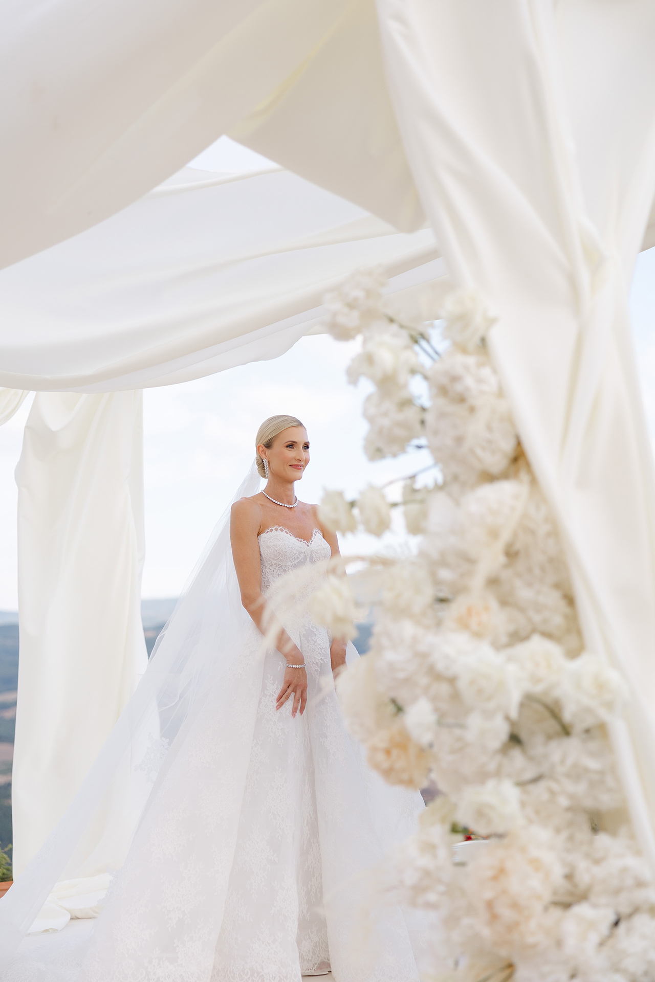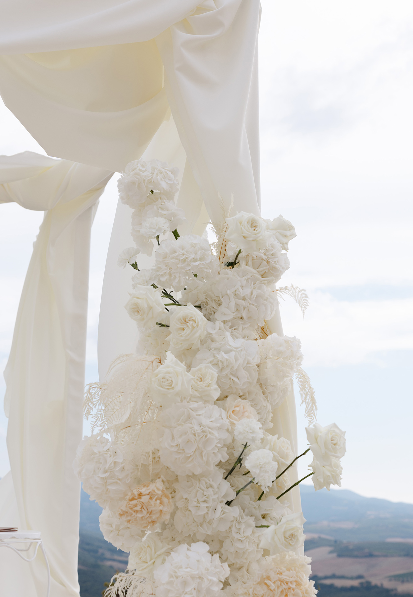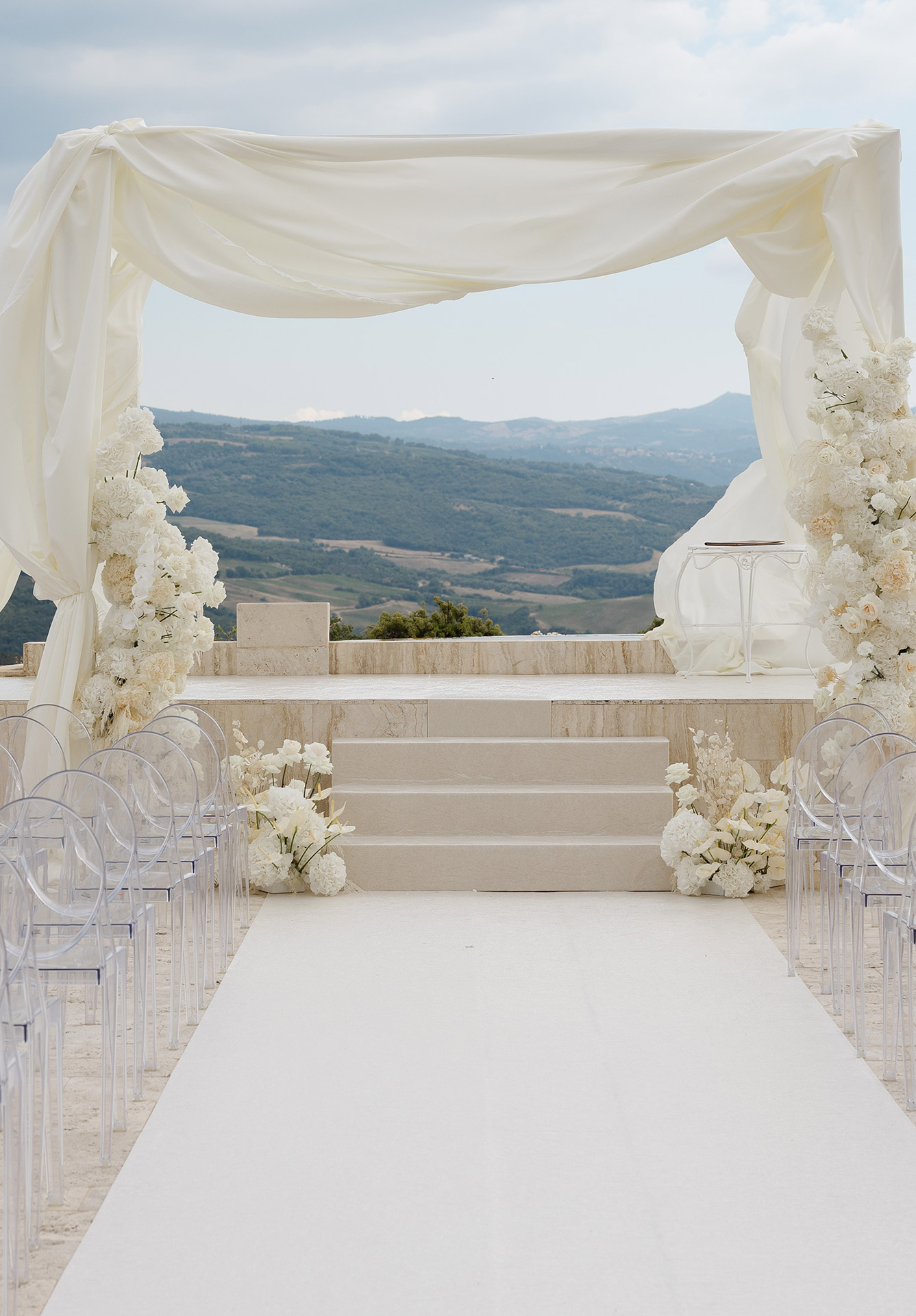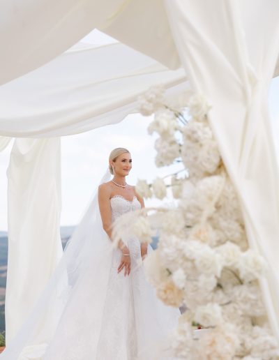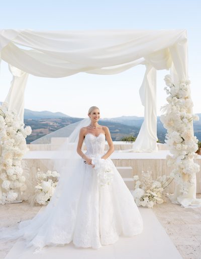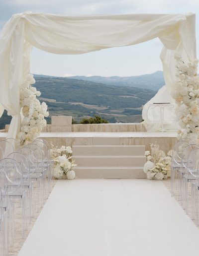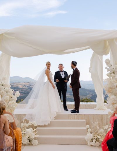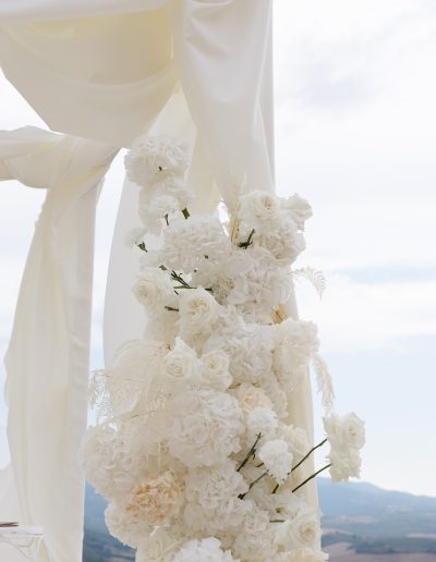 As the soft Tuscan afternoon light began to envelop the scene, the ceremony unfolded in an atmosphere that felt almost dreamlike. Guests were seated in a sea of white beneath a canopy of floating floral arrangements, creating the illusion of being surrounded by a soft cloud suspended above the ceremony space.