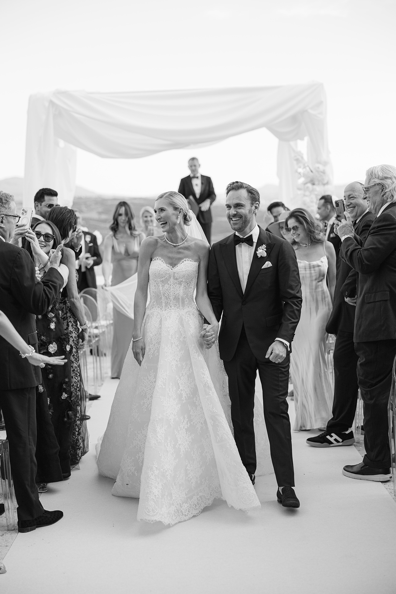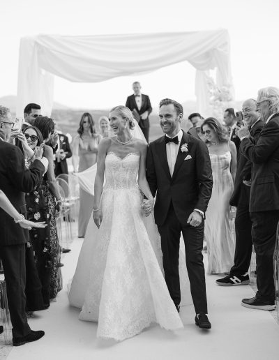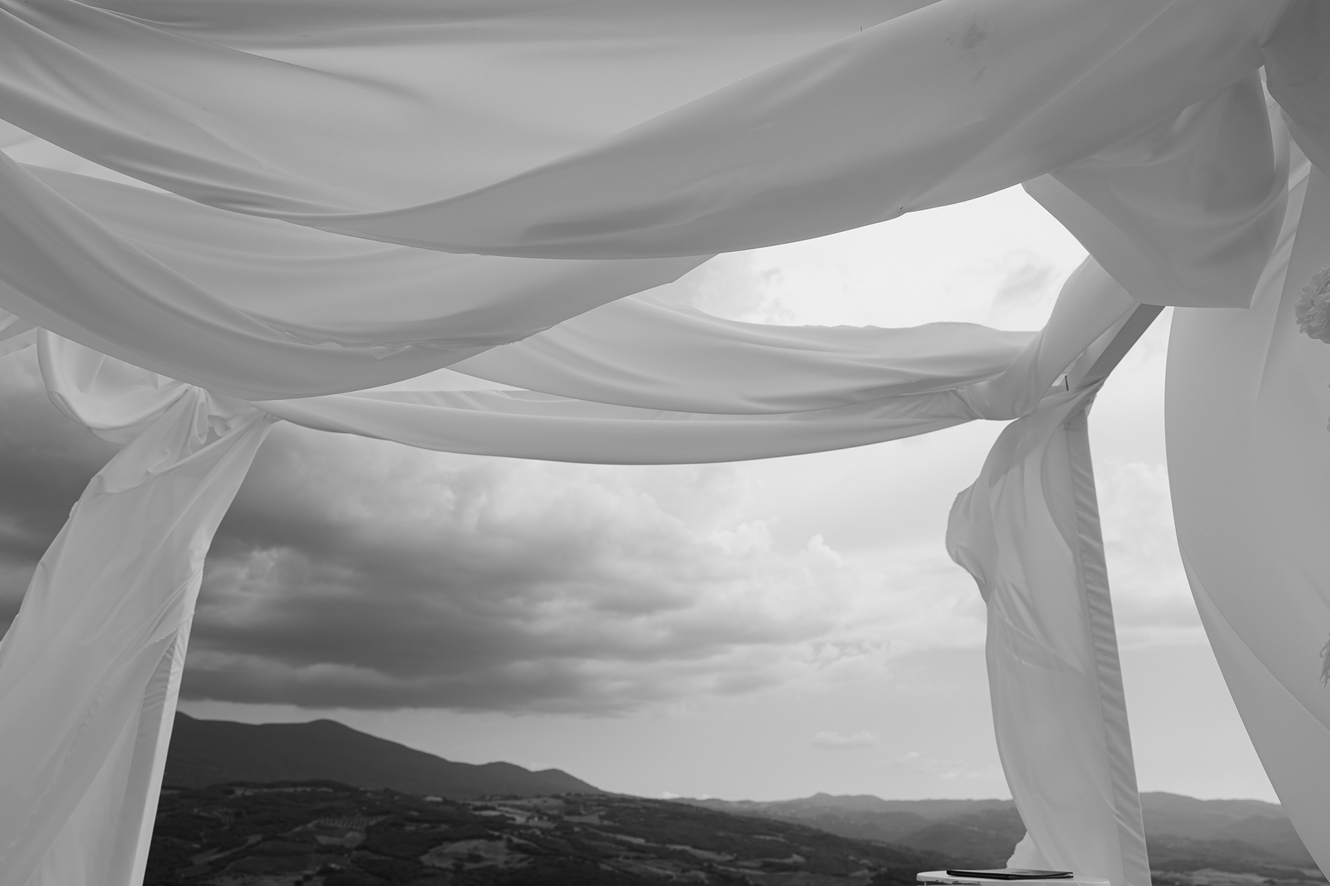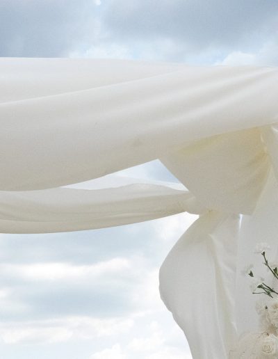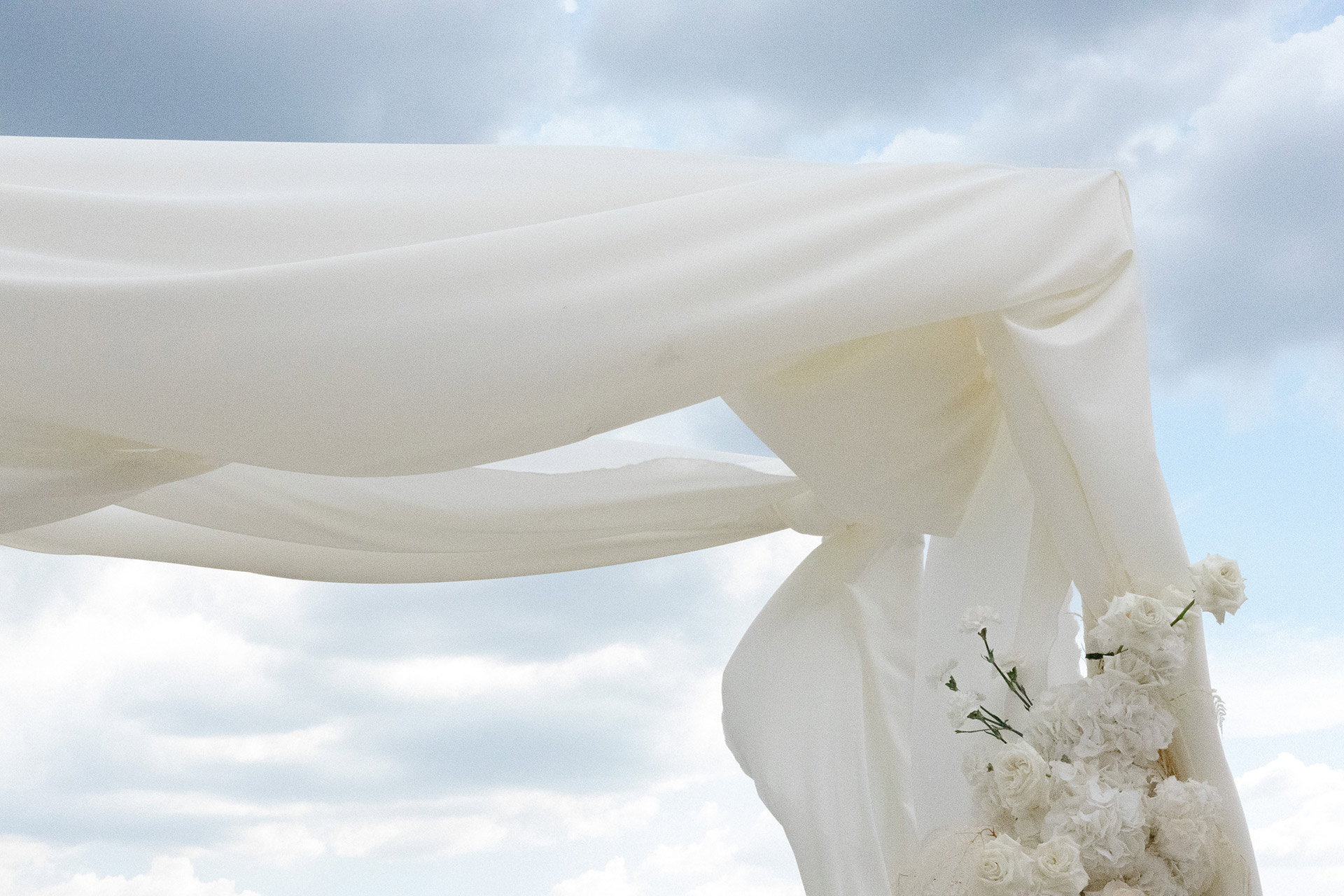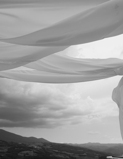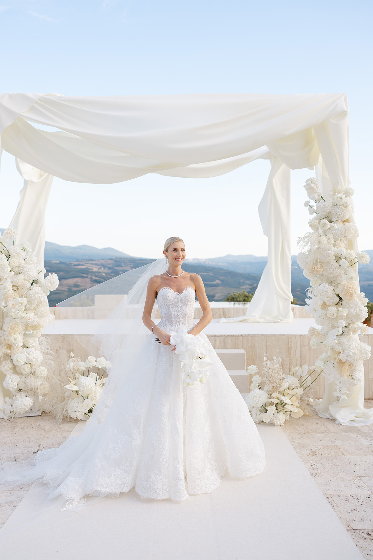 As the soft Tuscan afternoon light began to envelop the scene, the ceremony unfolded in an atmosphere that felt almost dreamlike. Guests were seated in a sea of white beneath a canopy of floating floral arrangements, creating the illusion of being surrounded by a soft cloud suspended above the ceremony space.