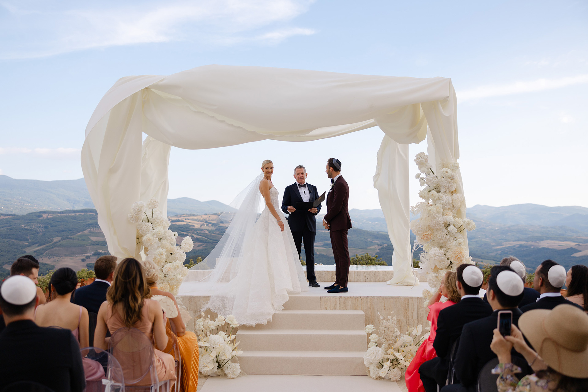 Set among the rolling hills of southern Tuscany, Castello di Velona offered the perfect setting for this elegant Jewish destination wedding in Italy. Surrounded by vineyards, historic architecture and breathtaking views over the Tuscan landscape, the celebration brought together timeless beauty, cultural tradition and refined design.